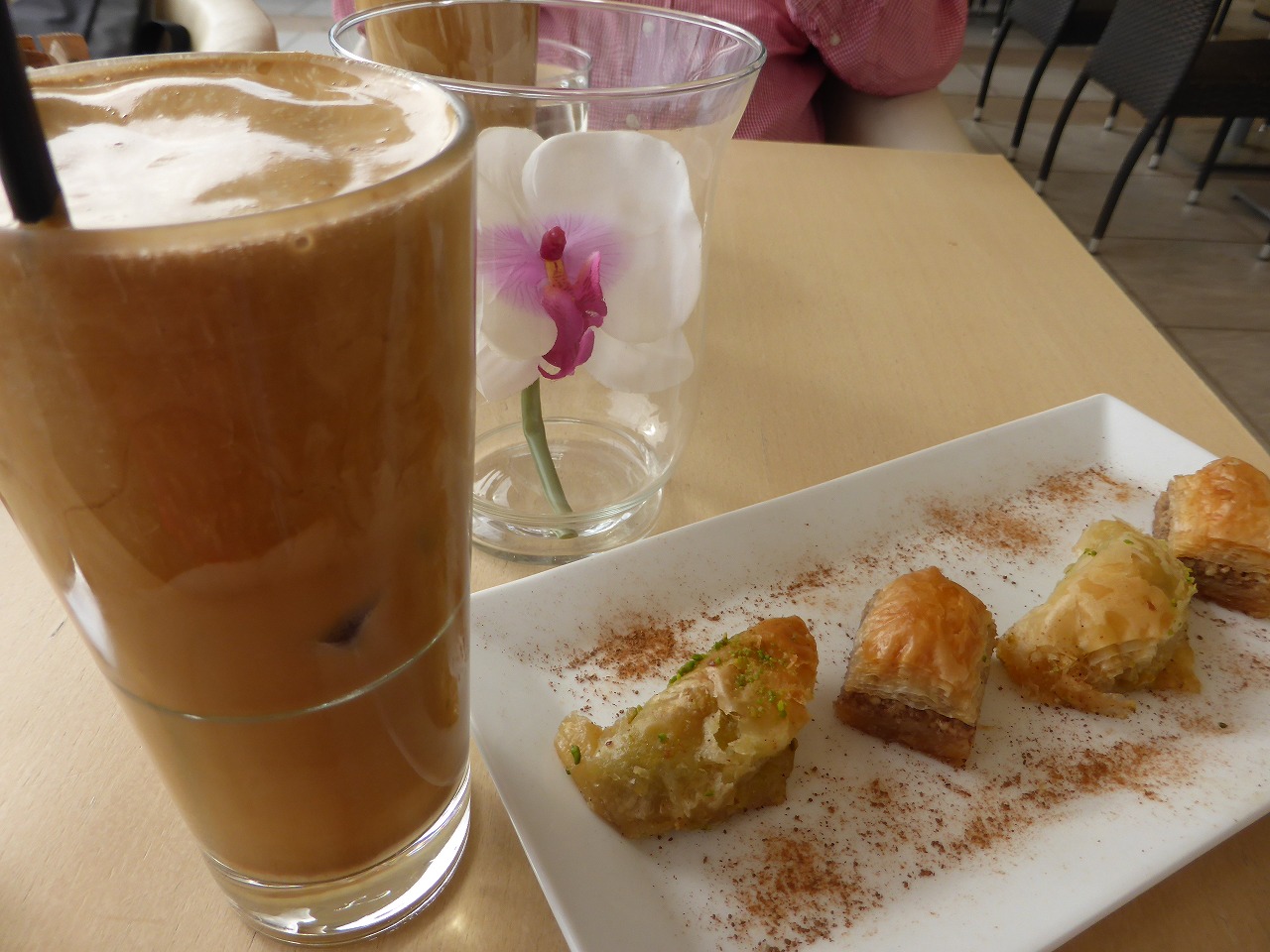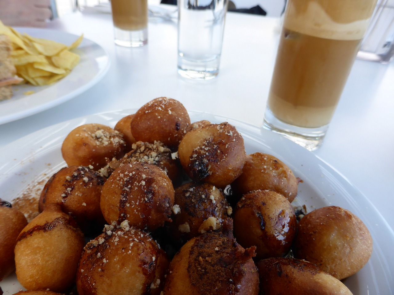 「アクロポリス博物館」のカフェで軽食。 「ルクマーデス」は揚げドーナッツに蜂蜜やシナモンなどをかけた伝統菓子。飲み物はもちろん「フラッペ」で。