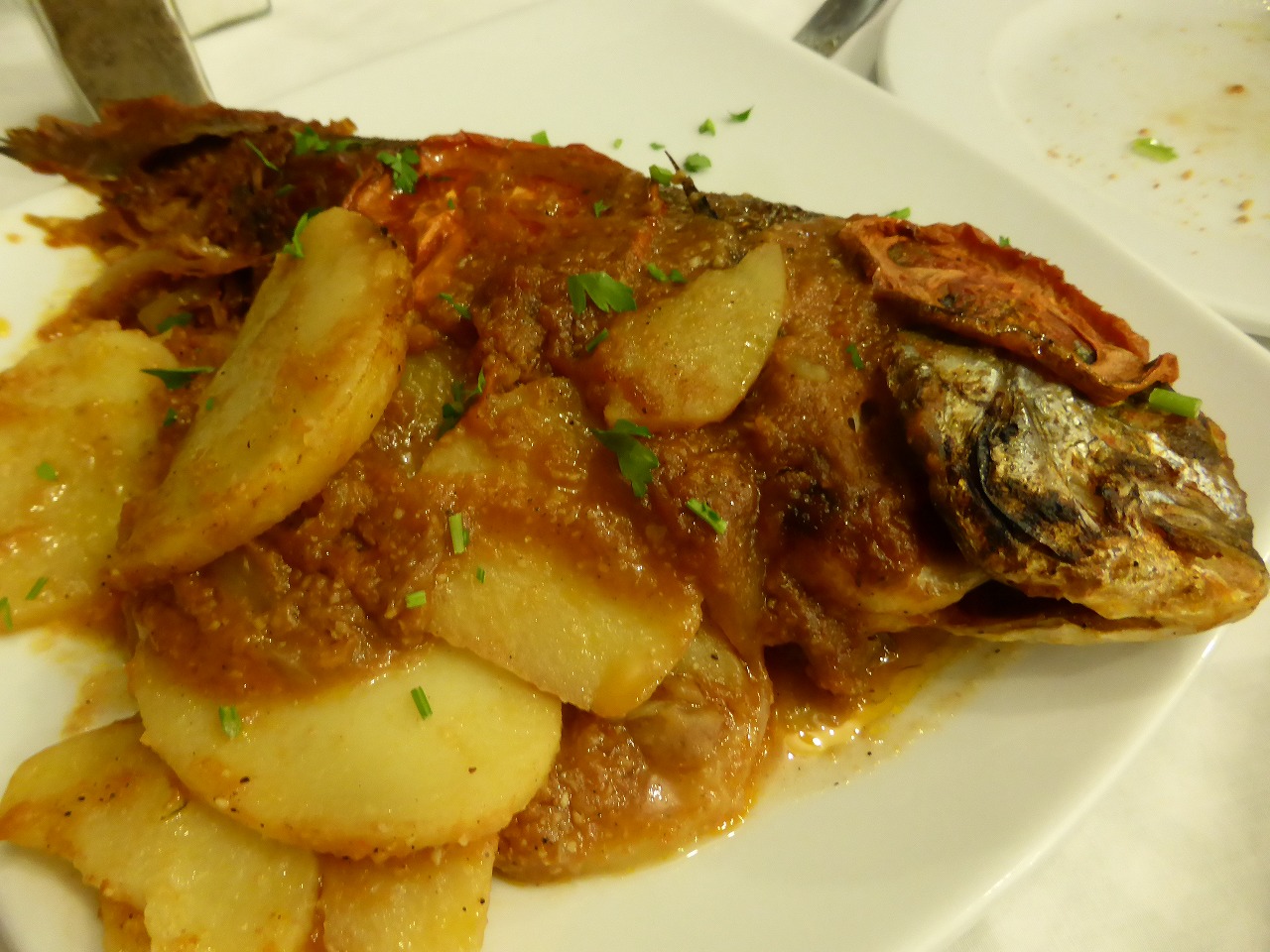 "Psaria sti schara" Grilled fish with tomato source. Big sea bream. |