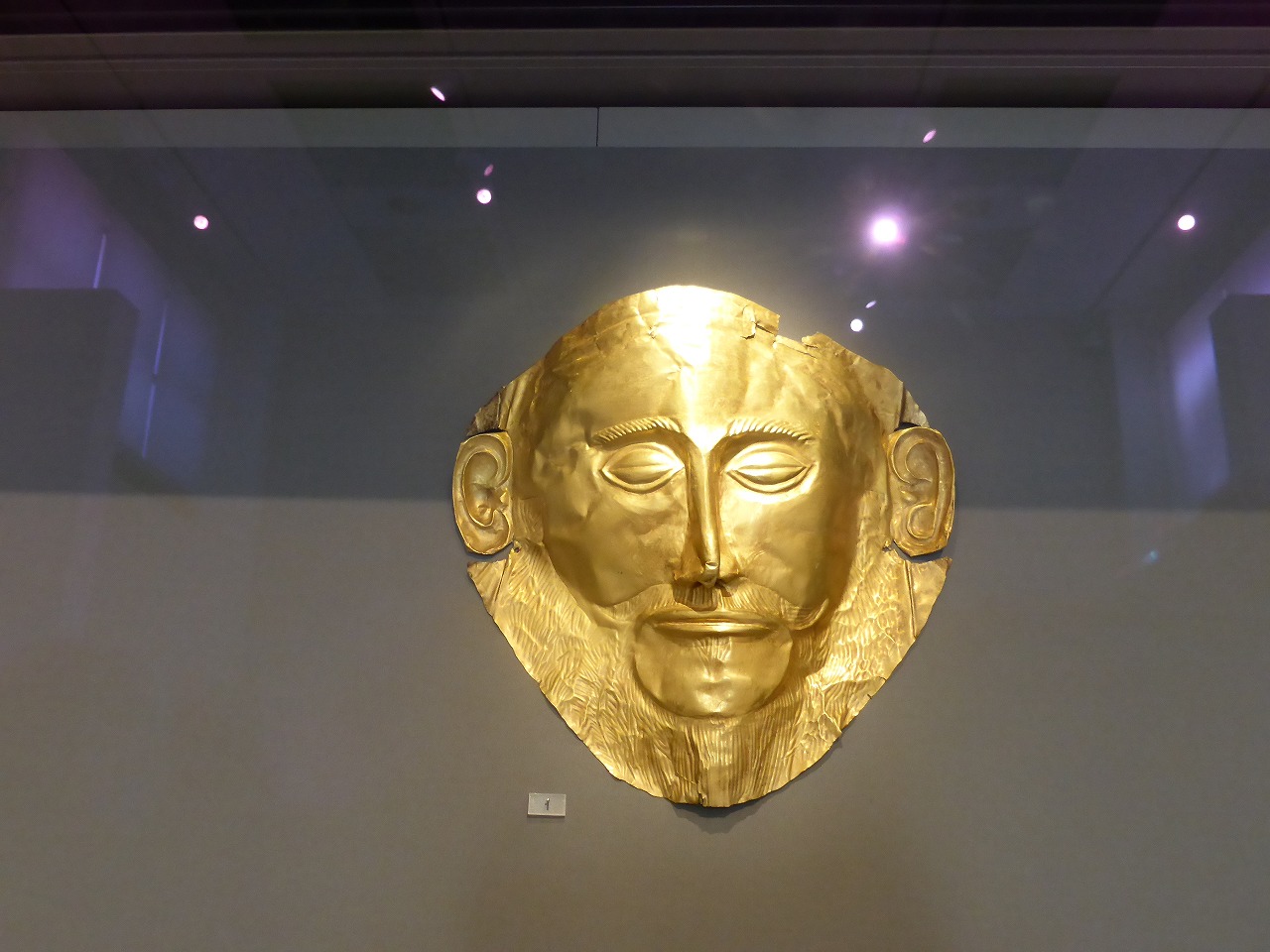「国立考古学博物館」 「アガメムノンのマスク」 これは、ミケーネで1876年にハインリッヒ・シュリーマンによって発見された遺物です。金でできた葬儀用の仮面であり、埋葬穴にあった死体の顔の上で発見されました。シュリーマンは、伝説上のギリシアの指導者アガメムノンの死体を発見したと信じましたが、現代の考古学的調査はこの仮面が紀元前1550年から1500年のもので、これまで言われてきたアガメムノンの活動期より早いことを示唆しています。