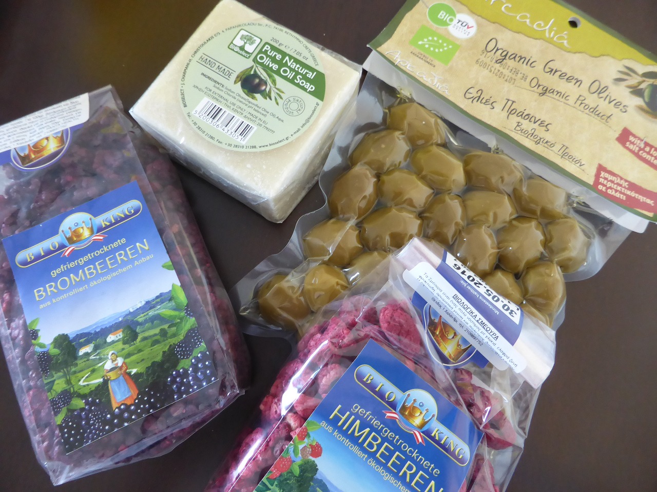 ドライフルーツとオリーブ、オリーブオイル石鹸。どれもBIOだよ。