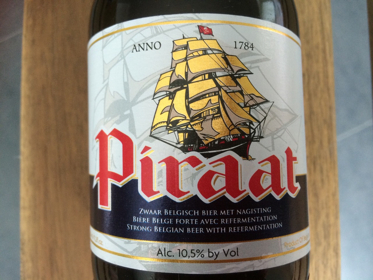 「ピラート・10.5% Piraat 10.5%」 ヴァン・スティーンベルグ醸造所の製品。濁った濃い金色でオフ・ホワイトの豊かなふわふわした泡立ち。少しパンの混じった芳醇なフルーティーな香り。主に甘く最後にアルコールの強さが来ます。もちろんアルコール度数は10.5%。