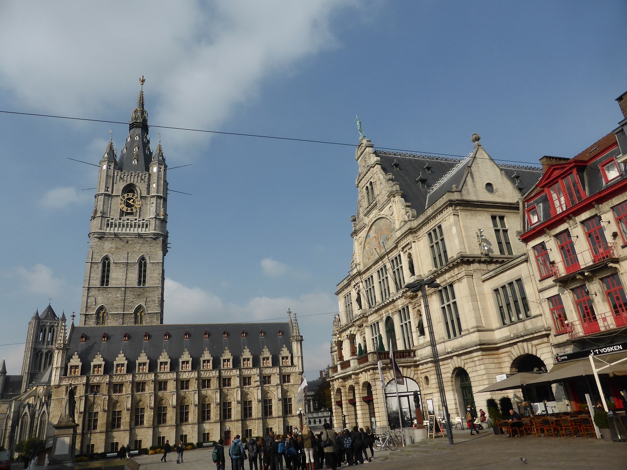 世界遺産の「鐘楼と繊維ホール」 鐘楼に隣接する長方形の建物は中世に街を富ませた繊維貿易事業の本部として建てられました。建築は1425年に始まり20年間続きましたが計画された11の翼の7つしか完成しませんでした。1903年にオリジナルの計画に基づき4つの翼で建物は拡張されました。