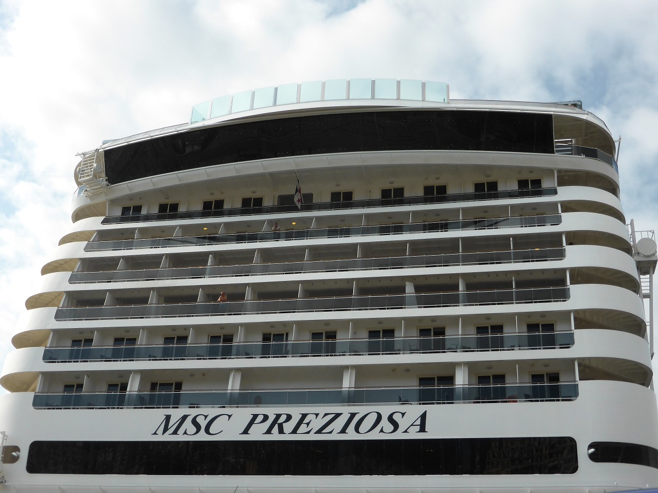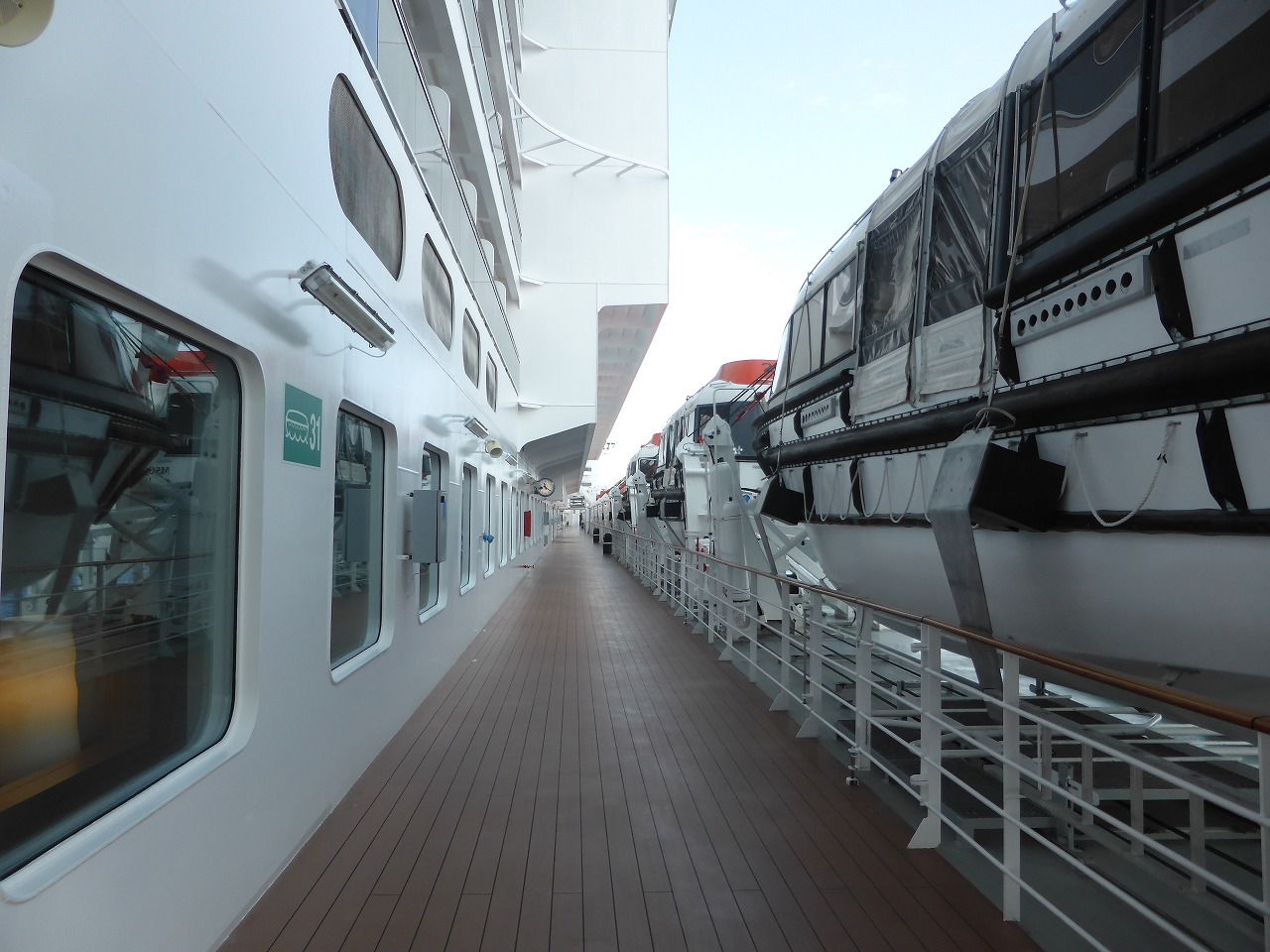 クラブメンバーは専用の案内の方が優先して乗船させてくれます。船が見えてきたよ。18階建て。15階から上がクラブメンバー専用エリア。