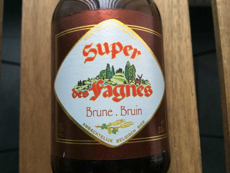 「スーパー・デス・ファーニュ・ブリューン Super Des Fagnes Brune」 ファーニュ醸造所で醸造。色は濃いブラウンで泡も茶色。濃い麦芽と濃いベリー系の香り。他のビールとくらべて甘さは少ないです。アルコール度数は7.5%。
