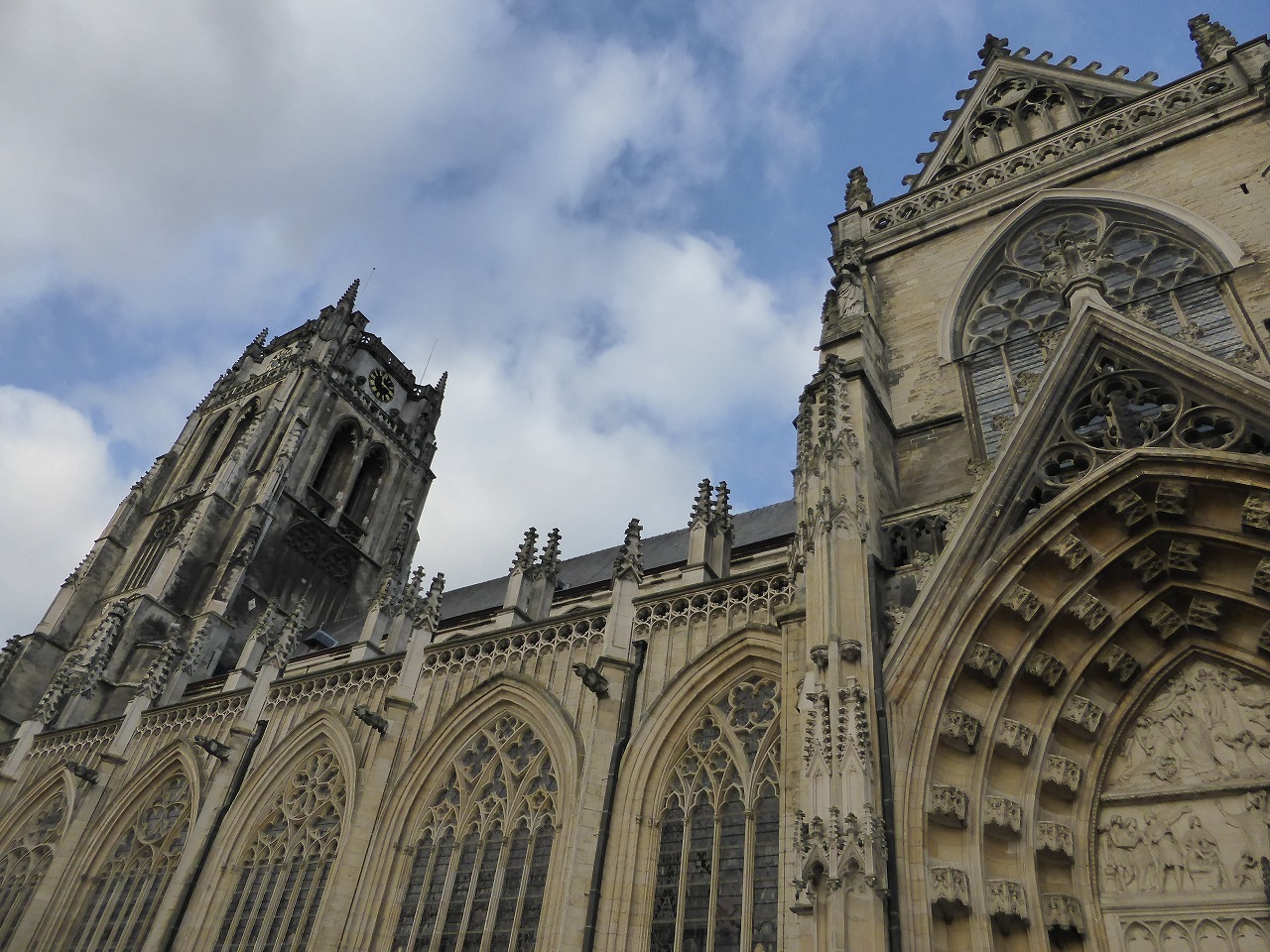 The belfry of The Tongeren Basilica. The original Romanesque tower was replaced by the present, 64 m-tall Gothic tower from 1442 until 1541. |