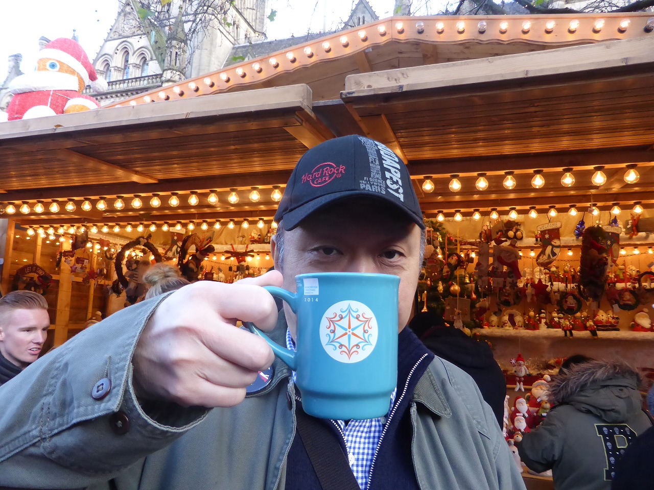 「タウン・ホール・クリスマスマーケット」 ここでもホット・ワインを頂きます。オリジナルのマグカップで提供されます。マグカップを返すと2ポンド返金されます。