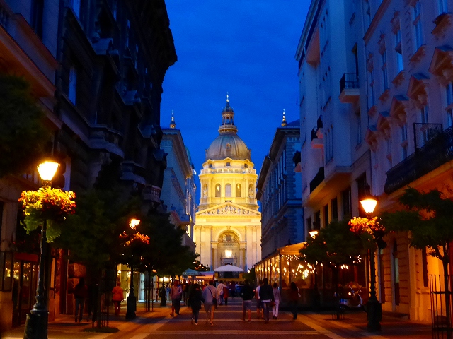 夜の「聖イシュトヴァーン大聖堂」。レストランからの帰り道。
