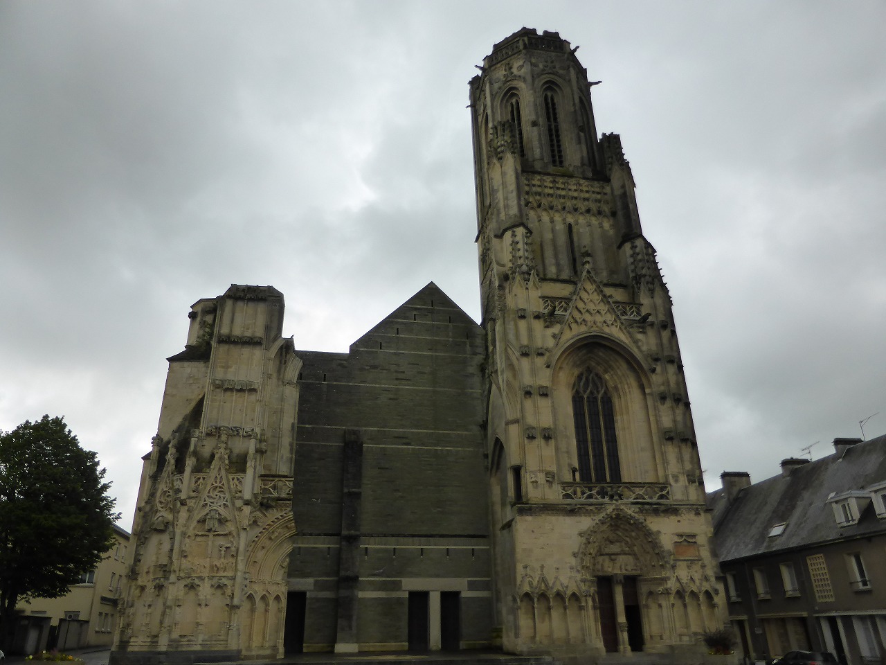 今回のメインはモン・サン・ミッシェル修道院なのですがその道中にある第2次大戦の激戦地も見て回ろうと思いました。ノルマンディー上陸作戦70周年ですし。まずはサン・ロー。その大聖堂。ここは米英軍の爆撃と陸上の激戦で街が廃墟となりました。1944年の爆撃の後、建っていた建物は13世紀から15世紀にかけて城の教会を置き換えたフランボワイアン・ゴシック様式のこの大聖堂だけでした。ファサードと天井は破壊され、2つの塔も一つは破壊されもうひとつは頂上部分が破壊されました。ヨーロッパの街はその後、ワルシャワのように意地になって修復した街とこのサン・ローのように戦争の記念としてそのまま残そうという街に分かれます。ちなみにサン・ローは米軍の護衛空母の名前となり、その空母は第一回神風特攻隊の敷島隊によって撃沈されています。
