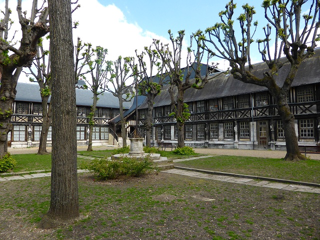 「サン・マクルー中庭」 14世紀ルーアンをペストが襲った際、周辺の4分の3の住民が亡くなり、その遺骨を収容されるために作られた建物。木の柱に骸骨や墓を表す彫刻が残り、なんとなーく不気味な感じ。現在は美術学校として利用されています。