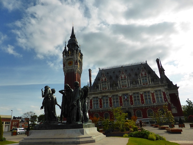 「カレー」 これは市庁舎。フレミッシュ・ルネッサンス様式で1911年から1925年にかけて1885年のカレーとサン・ピエールの統合を記念して建てられました。以前の市庁舎は1818年に建てられました。この街も第1次、第2次世界大戦で破壊され廃墟となりました。ここの鐘楼は世界遺産のひとつに登録されています。