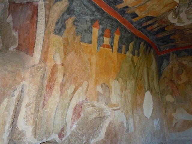 外から見るとこんな感じ。14世紀にはブルガリア一帯のヘシカズムの中心地となり、オスマン帝国に組み込まれた当初も存続し続けましたが、漸次衰退していきました。修道院の建築物群の名声は、その多くを13世紀から14世紀にかけてのフレスコ画に負っています。それらは教会群の内の5つの教会に保存されており、中世ブルガリア美術の傑作として評価されています。岩窟施設群は修道士たちに使われていたもので、大天使聖ミカエル礼拝堂、洗礼堂、Gospodev Dol礼拝堂、聖テオドルス礼拝堂や、中心となる聖母教会などを含んでいました。特に聖母教会に残る14世紀の壁画はおそらく最も有名なもので、かつPalaeologan美術の最も優れた例証とされています。