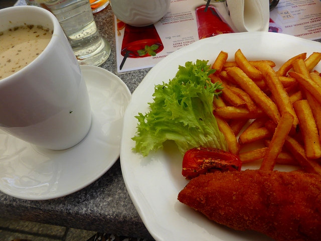 朝、出発すればランチはクラクフで食べられます。ポーランド料理 チキンの「コトレト」。日本のチキンカツ。スープは「グジボヴァ・ズパ」。キノコのホワイトソースのスープです。中央広場のレストランでいただきました。
