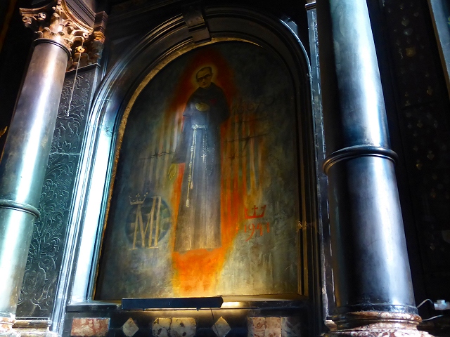 「コルベ神父」 聖フランシスコ教会に収められている絵です。「コルベ神父」は1930年布教のために来日。長崎・大浦天主堂近くに修道院を開きました。帰国後アウシュヴィッツ=ビルケナウ強制収容所に収容され、餓死刑に選ばれた男性の身代わりとなったことから「アウシュビッツの聖者」と呼ばれています。絵の背景のストライプはアウシュビッツの囚人服を表しているそうです。