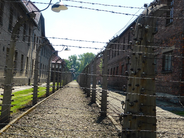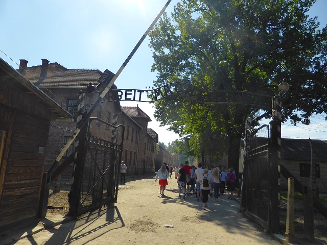 「アウシュヴィッツ・ビルケナウ強制収容所」 アウシュビッツ第1収容所は1940年5月に到着し始めたポーランド政治犯のために建てられました。囚人の処理は1941年9月に始まり、アウシュビッツ第2-ビルケナウ収容所はナチのユダヤ人問題最終解決の主要な場所となりました。1942年初めから1944年までドイツ軍占領地域からユダヤ人が列車でガス室へ運ばれ、そこで殺虫剤チクロンBにより殺害されました。「ARBEIT MACHT FREI (働けば自由になる)」の標語が掲げられた門。どんなに働いても生還できたのは10人に一人もいなかったそうです。「B」の文字が反転しています。