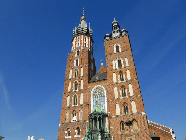 中央広場「聖マリア教会」 14世紀に再建(元々は13世紀初期に建設)されたレンガ製のゴシック教会です。教会内の木彫は国宝に指定されています。ステンドグラスも装飾も美しい教会です。毎時、Hejnal mariackiと呼ばれるトランペットの音が教会の2つの塔の頂上から流れます。悲しげな節が喧噪を破りますが、これはモンゴル軍の攻撃の警報を鳴らしていてのどを打ち抜かれた13世紀の有名なトランペッターをしのんでいます。