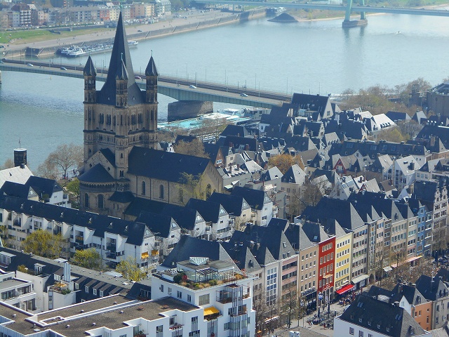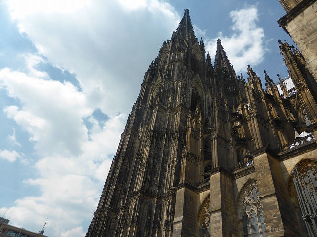 大聖堂の鐘楼にのぼるとケルンの街が一望できます。建物そのものが目標になったわけではありませんが、中央駅に非常に近いため第2次大戦中の空襲で14回も被害を受けました。ひどい損害を受けましたが、他の建物が完全に破壊された中、建物は残りました。2つの塔がドイツの奥深く潜入する連合国の爆撃機のいい道しるべになったことがこの建物が残ったことの説明になるかもしれません。