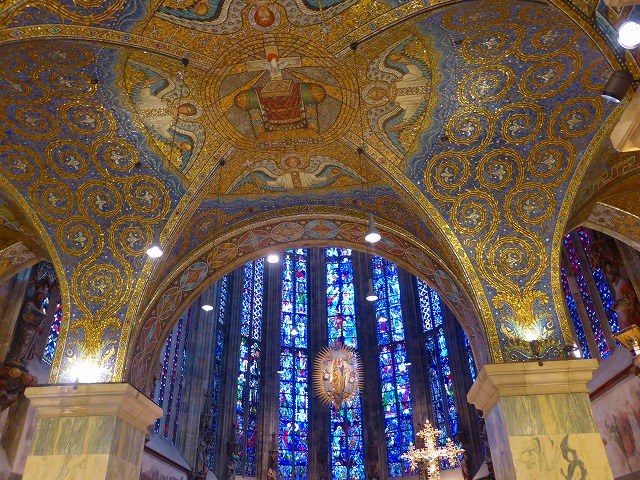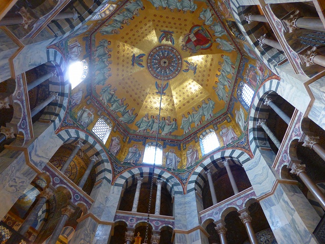 「アーヘン大聖堂」内部では素晴らしいモザイクが見られます。 カール大帝は796年頃他の王宮の建物と共にこの教会の建設を始めました。14世紀と15世紀にゴシック様式が加えられ、1881年に再度修復されました。