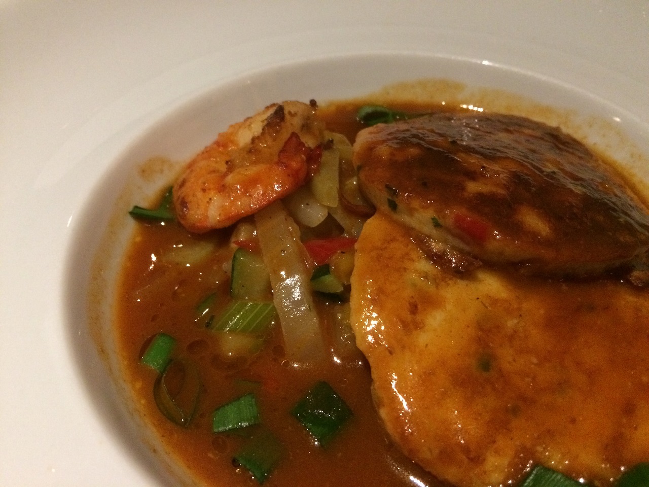 The hors d'oeuvres are gateau of prawns. Sauce is bisque of Omar prawns. It's thick.