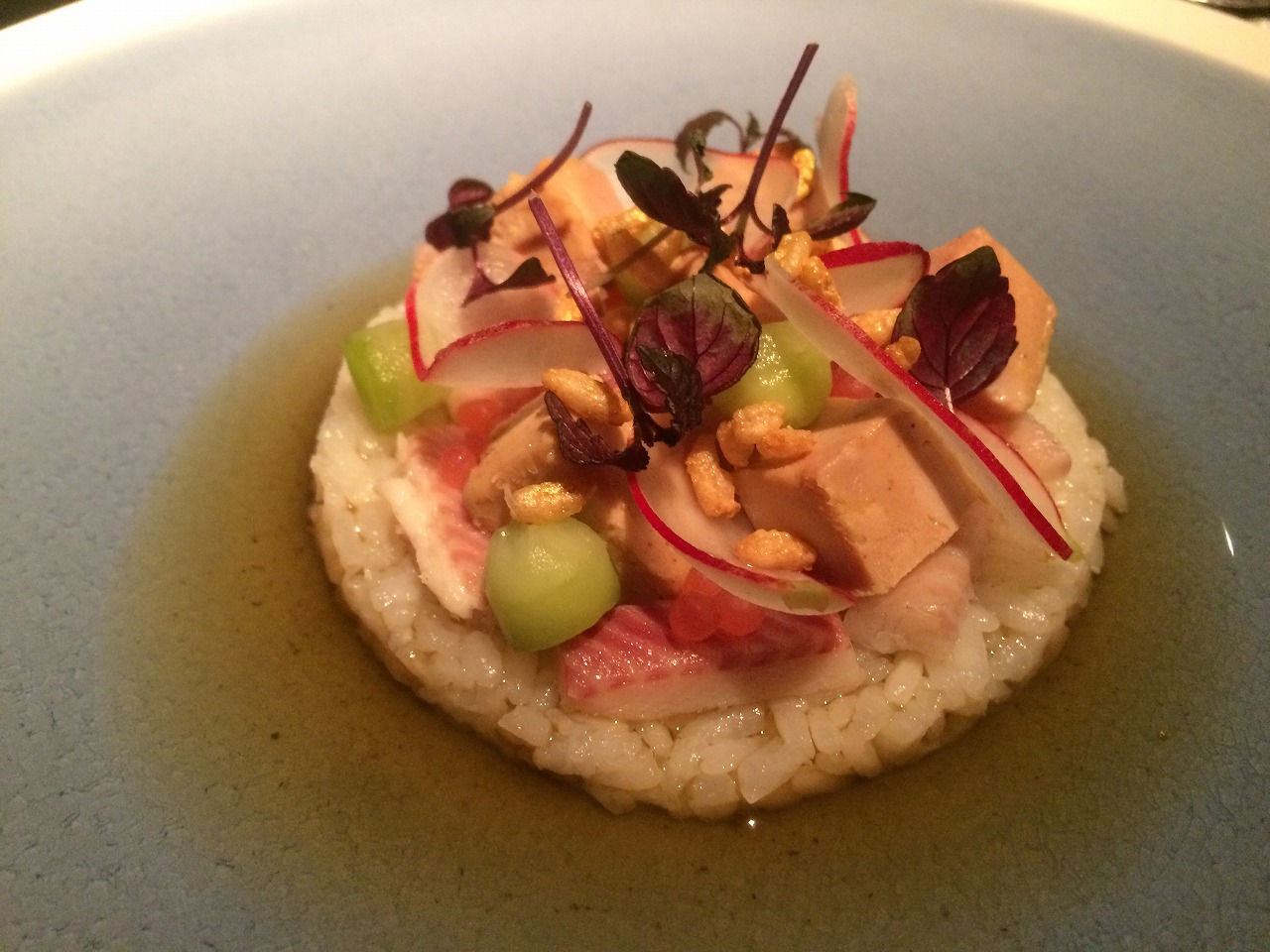 前菜。日本のちらし寿司からヒントを得た一品。寿司飯の上にマグロやフォアグラ、スモークされたウナギがのっています。ここに熱々の醤油ベースのソースをかけていただきました。見た目も楽しく、味も言うことなし。