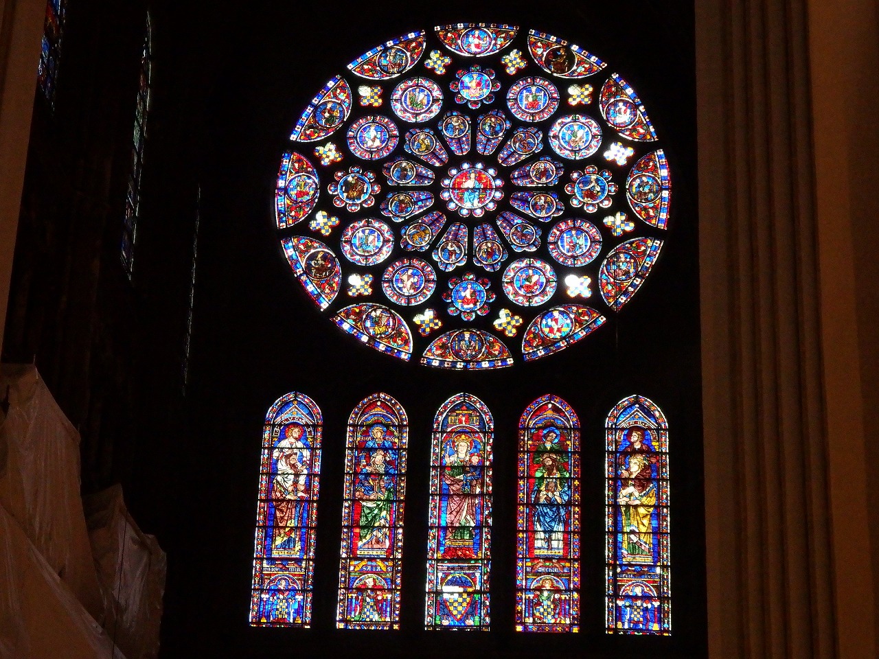 「ノートルダム大聖堂」の花窓。 ステンドグラスの「シャルトル・ブルー」と呼ばれる輝くような青は世界的に知られています。大聖堂には3個のバラ窓があります。これは南翼楼のバラ窓(直径10.5m、1225年から30年頃作成)で、祝福のために右手を挙げ、崇拝する天子に囲まれて中央に位置するキリストに捧げられています。