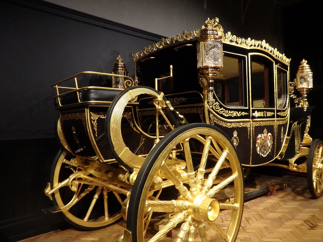 「ロイヤル・ミューズ」 ロイヤル・ミューズには、戴冠式や公式訪問、ロイヤル・ウェディング、議会開会式、公式行事などの際に使われる公用車(馬車および自動車)が保管されています。これは在位60周年公式馬車です。エリザベス2世女王の80歳の誕生日を記念して製作されましたが完成が8年近く遅れ、結局は女王在位60周年を記念するものになりました。