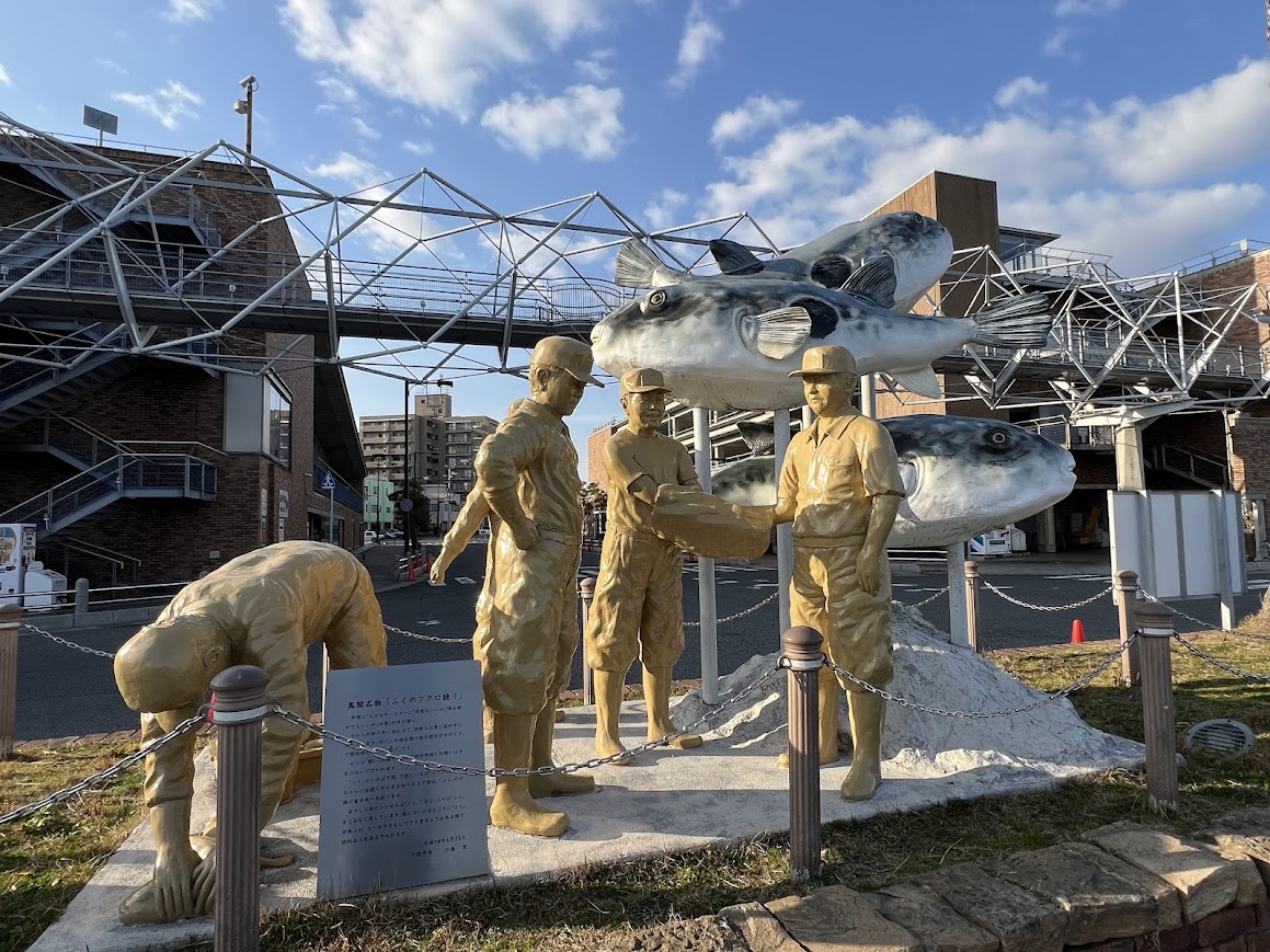 ふぐのオブジェって地図に書いてあったんだけど、けっこうふぐのオブジェはいろんなところにあって、どれかが有名なのか、それほどでもないのかよくわかんなかった。これはふぐと競りの様子がわかる像だったので、とりあえずこれを選びました。 |