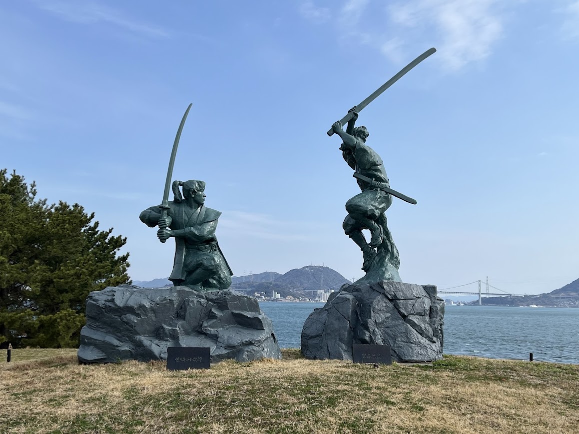周囲1.6qの小さな島な上に半分ぐらいは私有地で入れない。見るところもとくになくて、あっという間に見学できちゃいます。武蔵・小次郎像がいちばんの見所かな。小次郎の像は2002年12月に建立。武蔵の像は巌流島に遅れて現れたことにちなんで、小次郎より遅れて2003年4月に建立。 |
