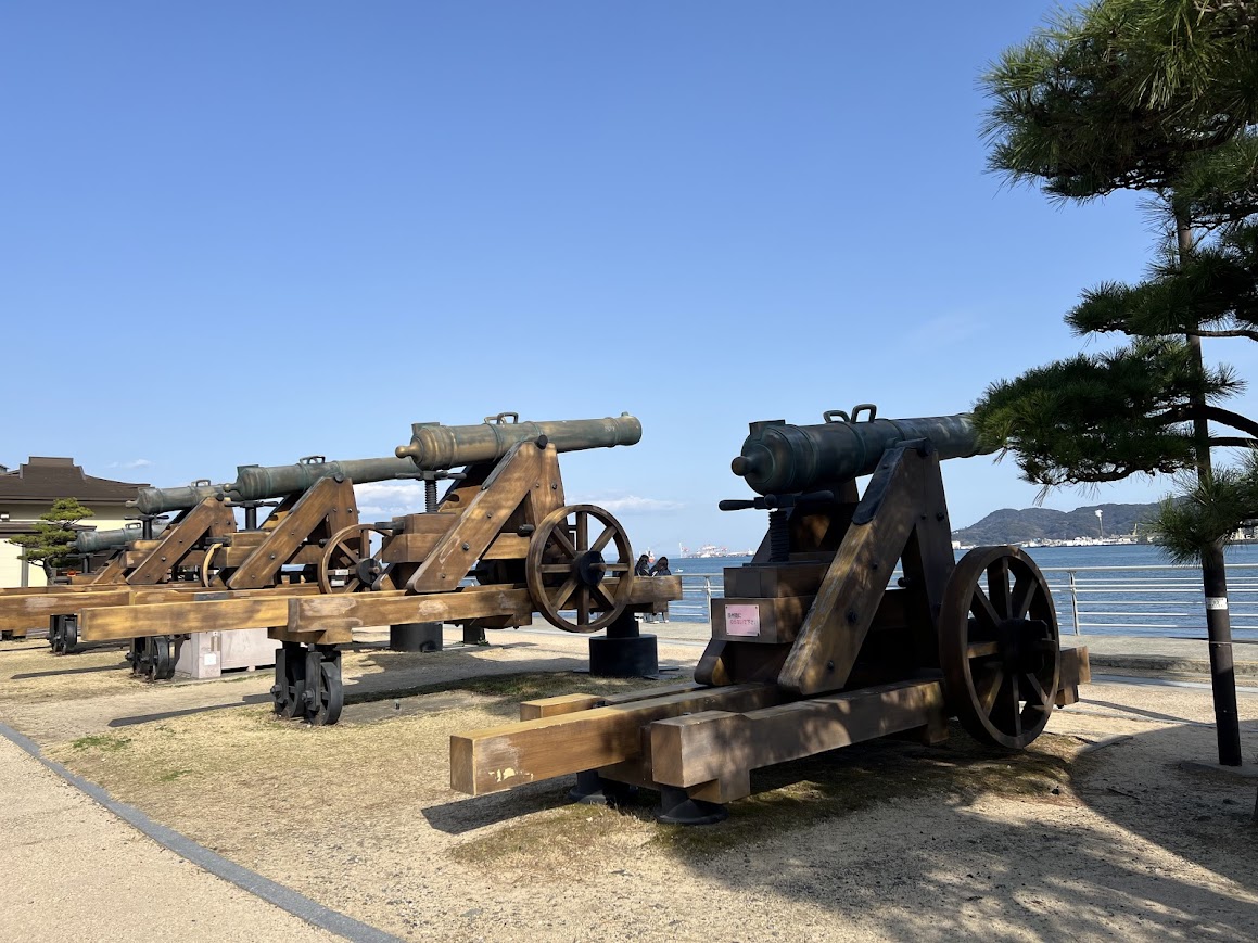源平合戦決戦の地は幕末に攘夷戦とも呼ばれる下関戦争もあり、長州藩の砲台が設置されていました。並んでいる砲台はレプリカです。 |