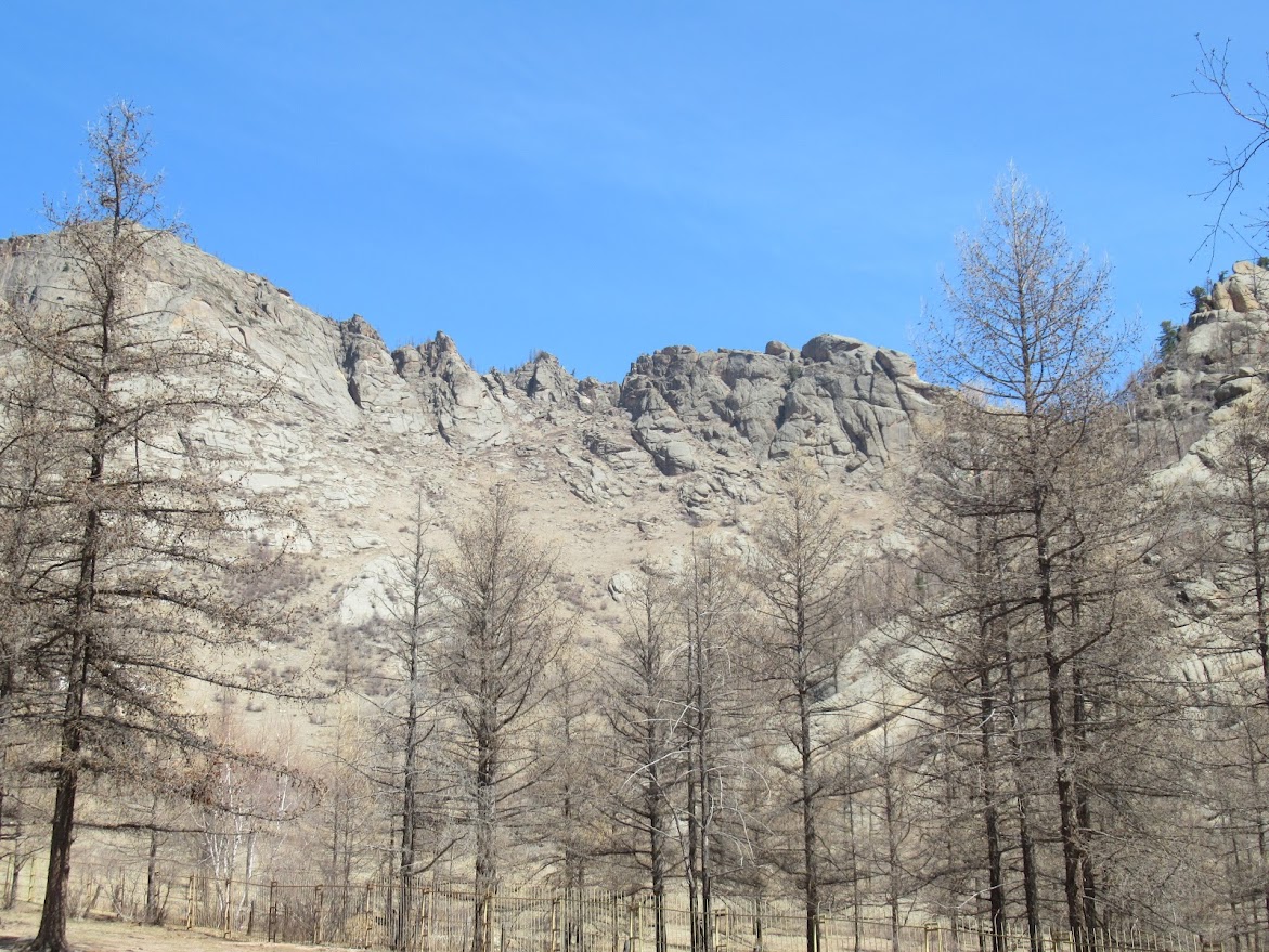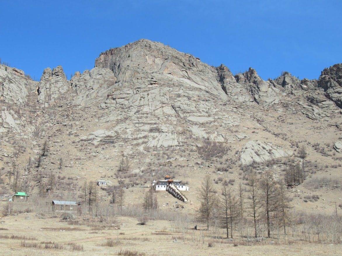 テレルジ国立公園内にある寺院に向かいます。ここは平原ではなくて岩山がそびえています。 |