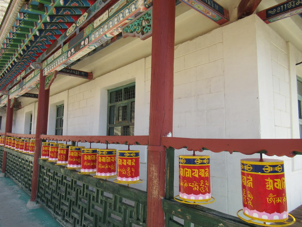 建物を囲むようにマニ車がこれも108個。これをまわすと経文を読んだことになるっていうありがたいもの。 |