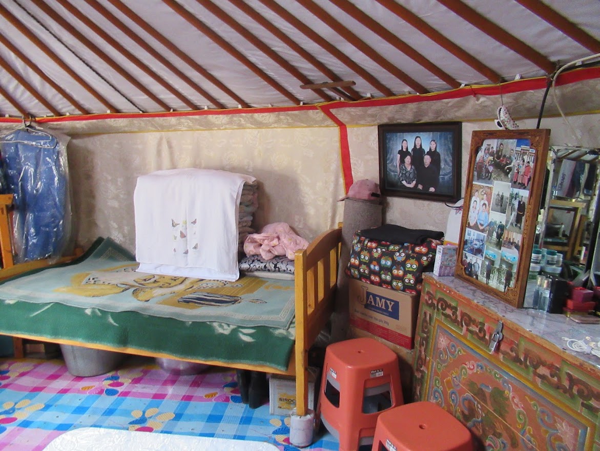 私たちの部屋はこんな感じ。シャワールームとトイレがあるゲルと通路でつながっています。夜は氷点下になるらしいので、ストーブの薪はたっぷりと。 |