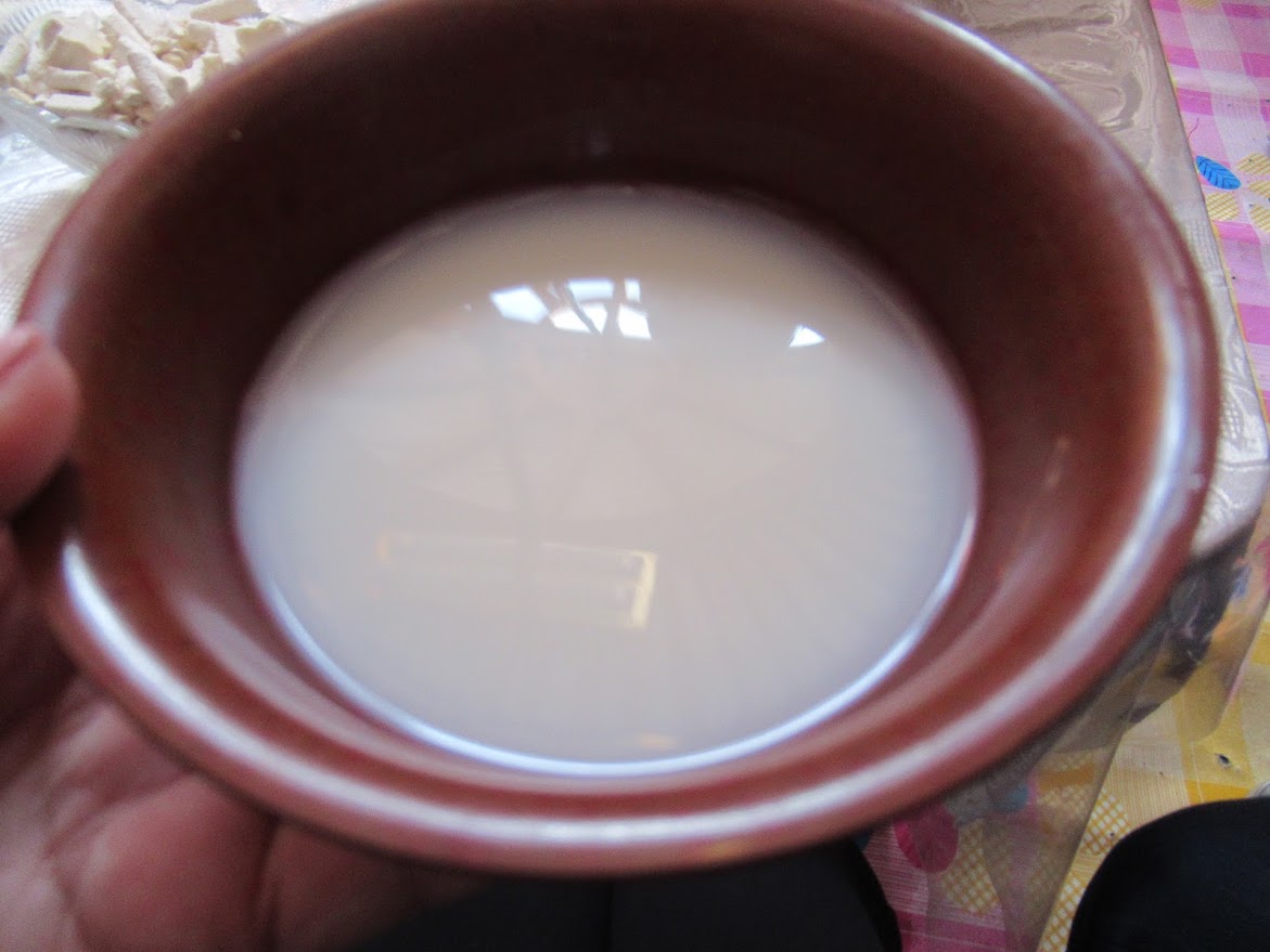 モンゴルのミルクティ「「スーテーツァイ」。ミルクたっぷりのミルクティって甘いと思うでしょ。そのつもりで飲んだらビックリする。塩味だったー。 思っていたのと違っていたからか、あまり飲めなかった。 朝昼夜と飲む、モンゴルの人たちにとっては健康の源らしい。帰り際にはそのミルクティを上下に向かって撒いて神様にお礼を言ったり、お客さまの健康を祈ったりするそう。 |