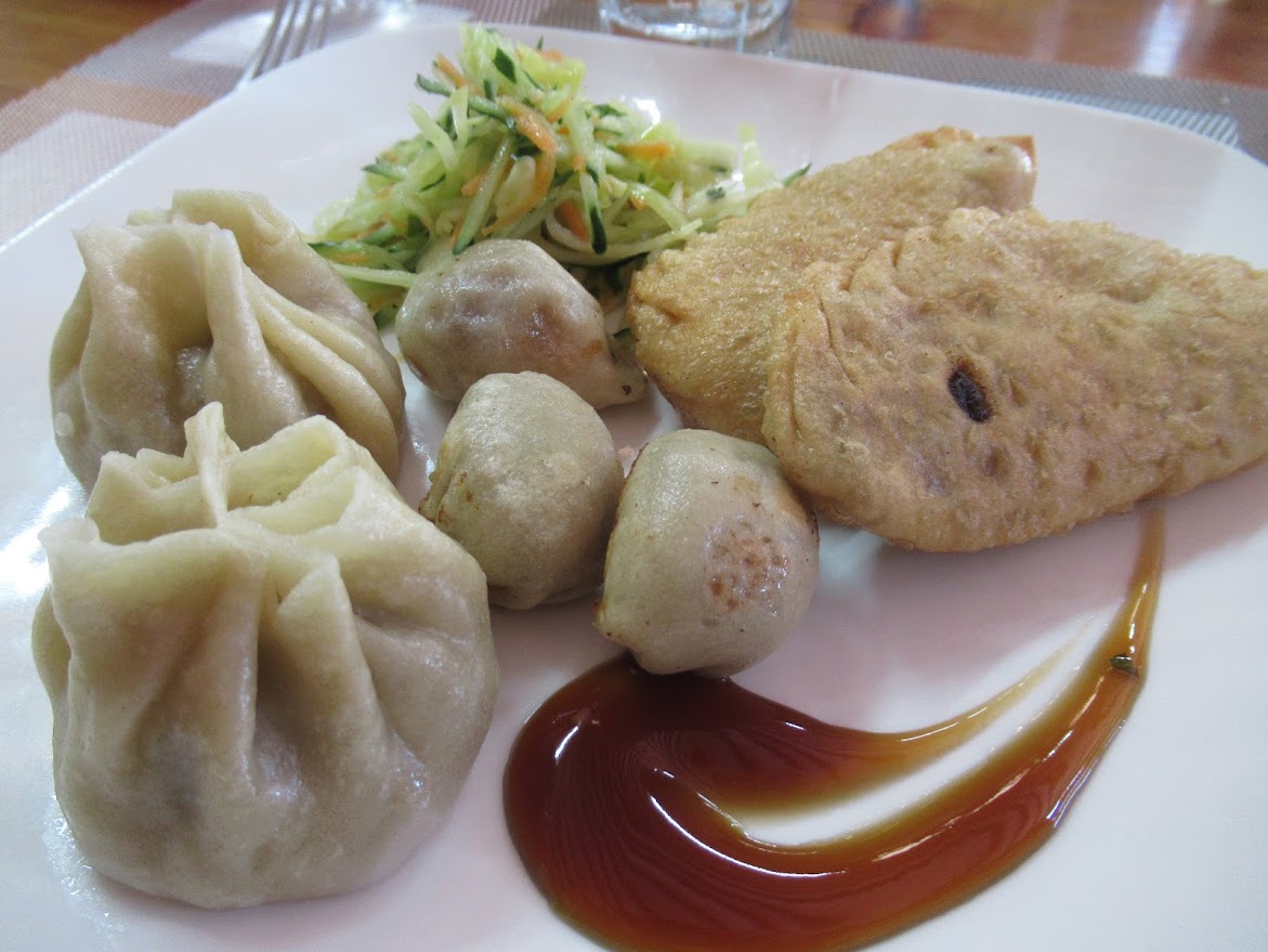 今日の食事。ゲルのキッチンで作るんだしなーって思ってたけど、けっこうオシャレで美味しい。揚げ餃子「ホーショール」やモンゴル風蒸し餃子「ボーズ」。 |