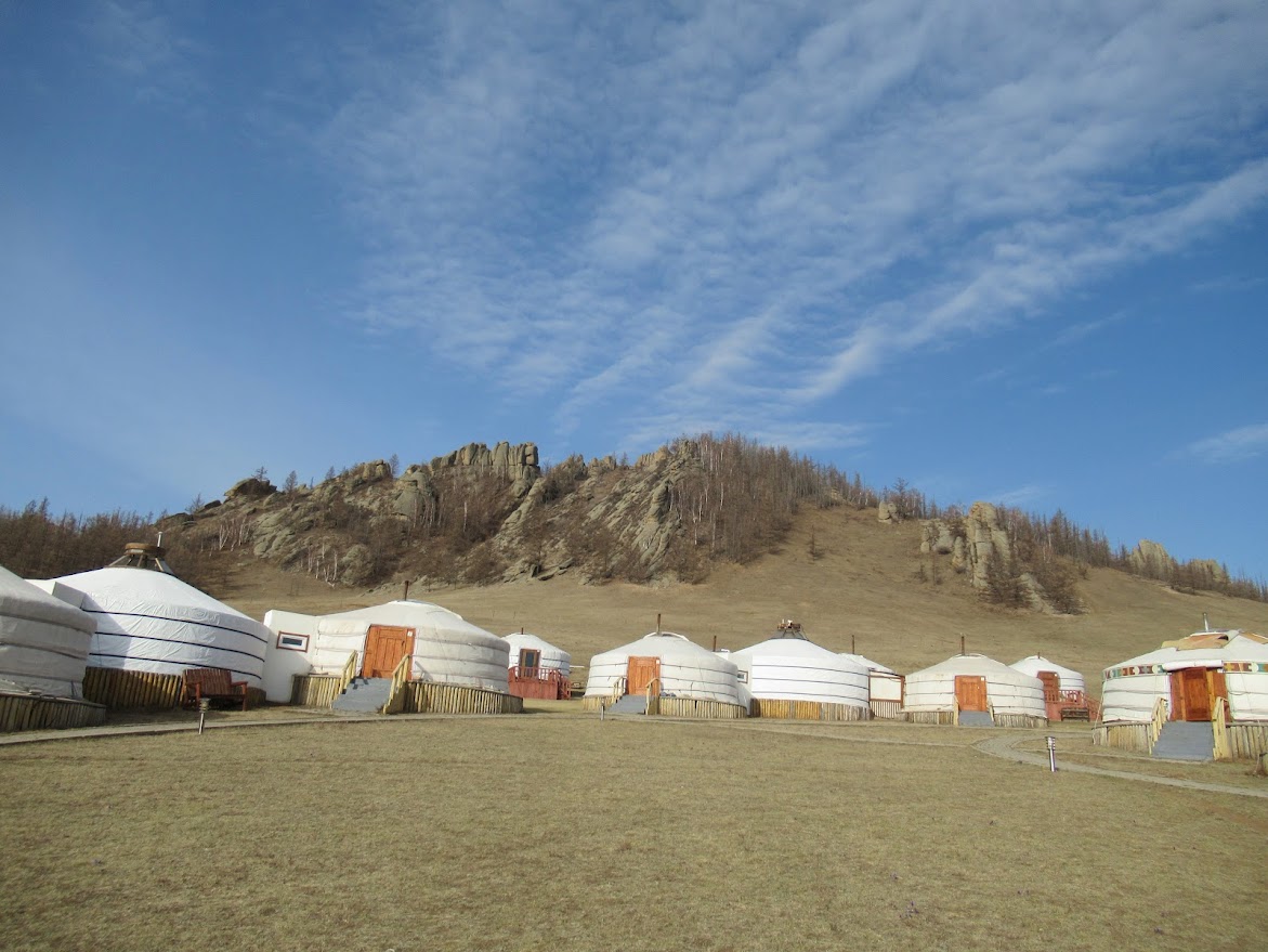 朝。ツーリストキャンプのお部屋のエリア。ゲル2つで1つのユニット。扉のないゲルは中でつながっていて、お風呂とトイレになっています。 |