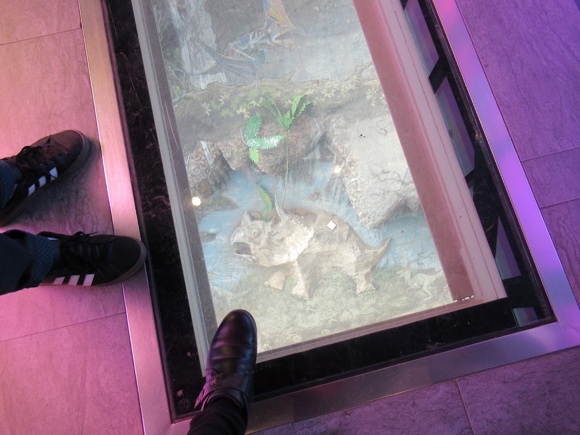 渡り廊下の床をのぞくと下に恐竜がいたよ! |