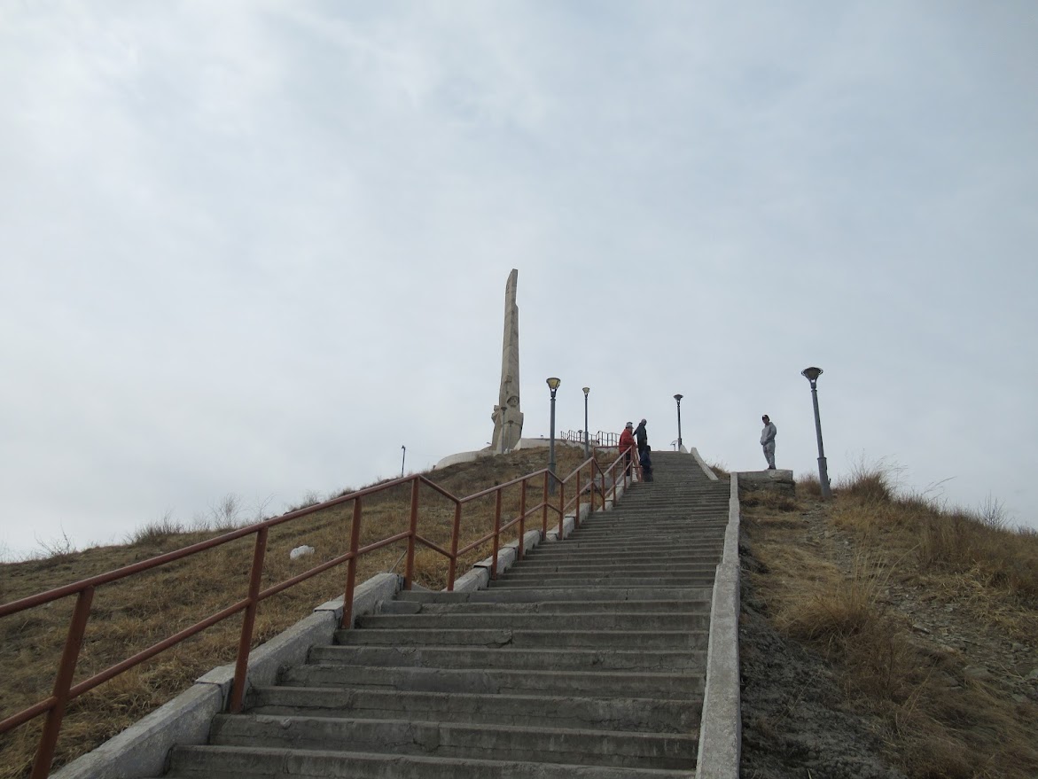 ウランバートルが見渡せる丘の上へ。丘の上に見えるモニュメントを目指します。手前にあるビルのエレベーターを使って途中まで上って、連絡通路をわたり、その先は階段です… |