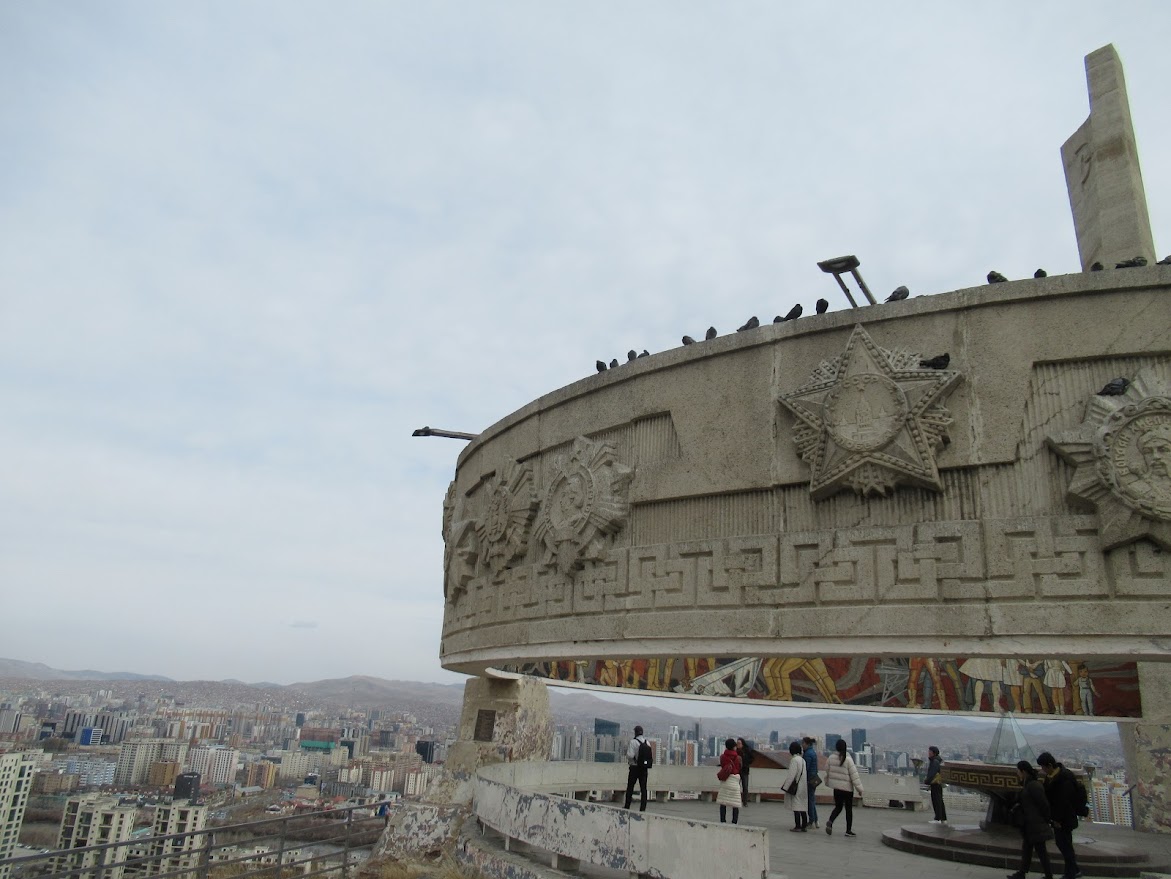 兵士が立っている様子のモニュメント。ウランバートルの景色を楽しんで降ります。 |