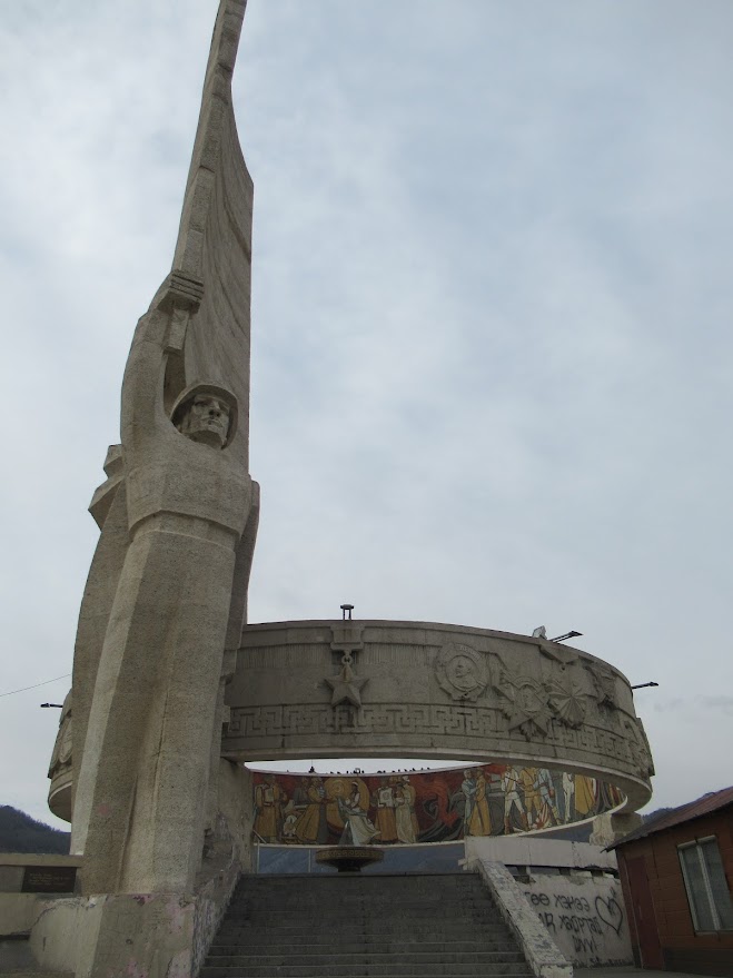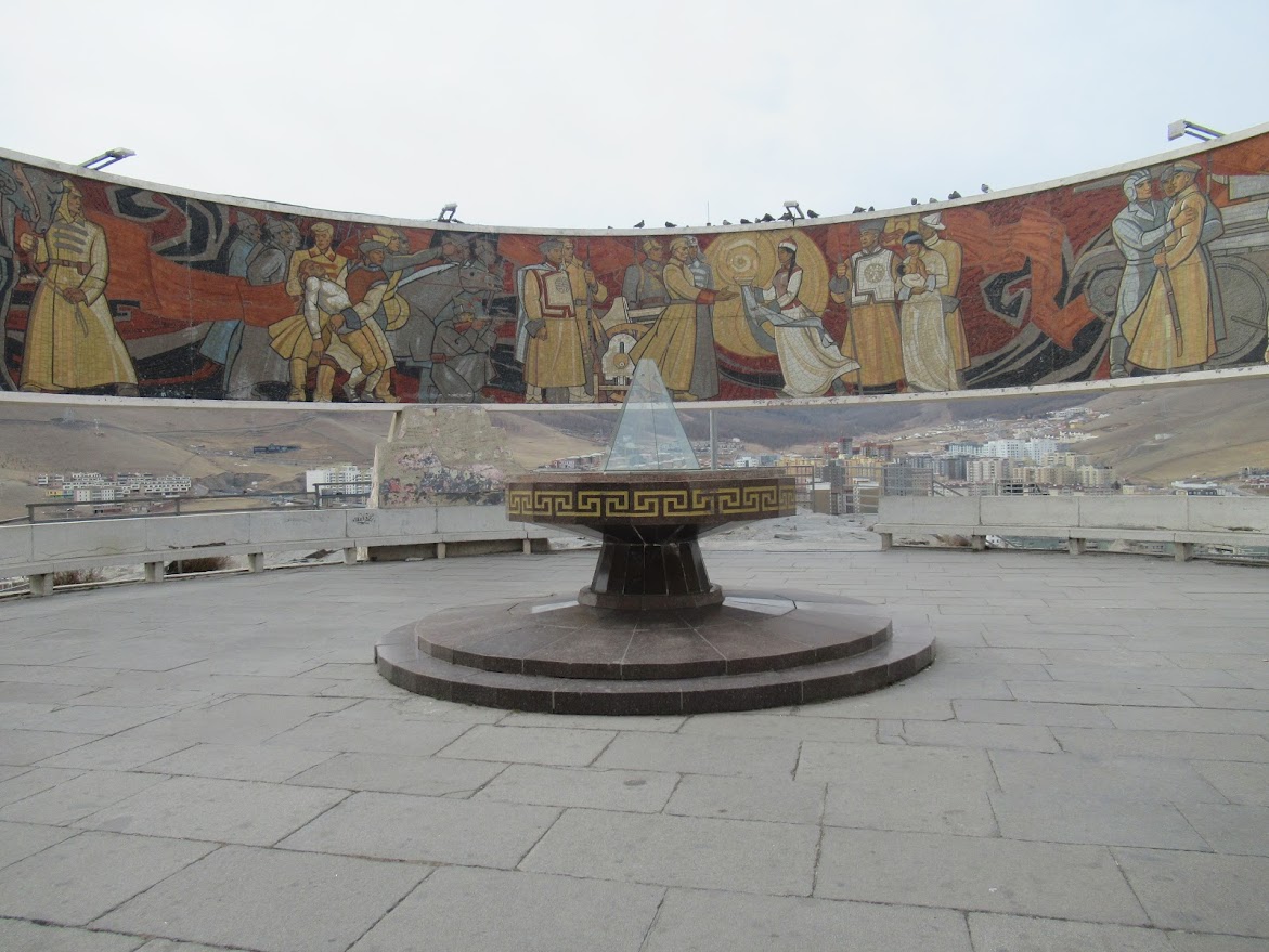 ザイサンの丘にある記念碑は日本およびナチス・ドイツを相手に戦い,第二次世界大戦で戦死したモンゴル,ソビエト連邦両国の兵士たちの栄誉を讃えると共に,共産主義革命50周年を記念して1971年に建てられました。モンゴルとソビエト両国間の友好関係を表現したモザイク画が描かれています。 |