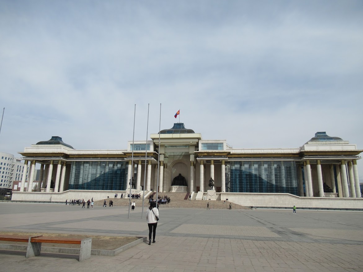 モンゴルの中心部、スフバートル広場(チンギスハーン広場)。どーんと存在感のある建物は国会議事堂です。 |