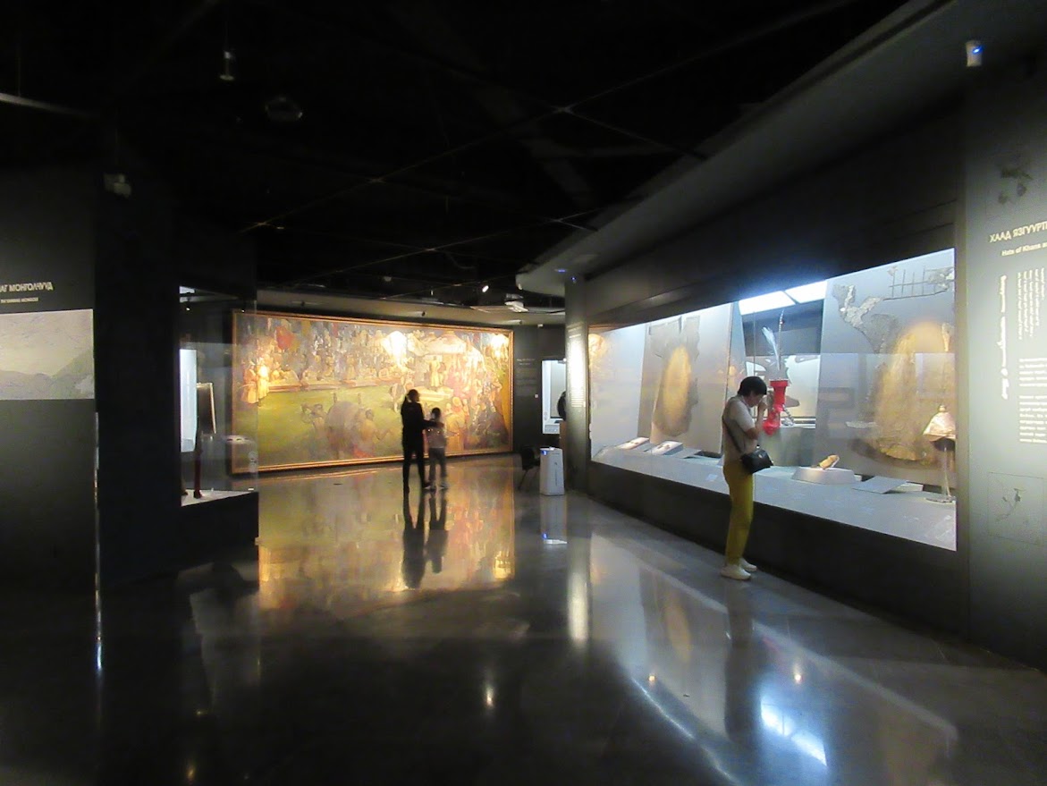 中は博物館になっています。ギネスブックに載っているモンゴル伝統のブーツとか歴代モンゴル帝国のハーンの肖像画などがあります。モンゴルの民族衣装を着て写真が撮れるみたいだったけど、そのコーナーも売店も閉ってた。 |