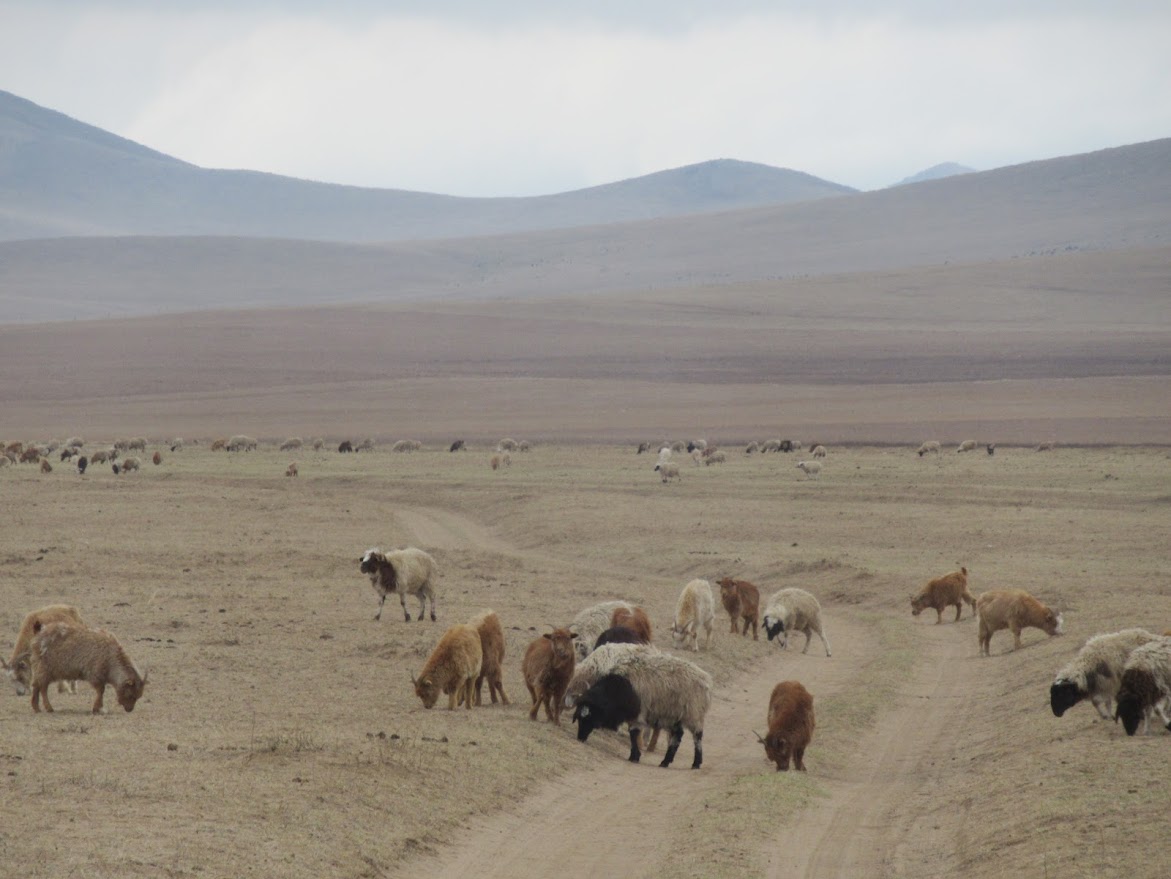 途中羊の放牧に出会いました。放牧範囲が広い広い。見渡す限り草原で、だれもいない。これでちゃんと管理されているのかと心配になります。 |
