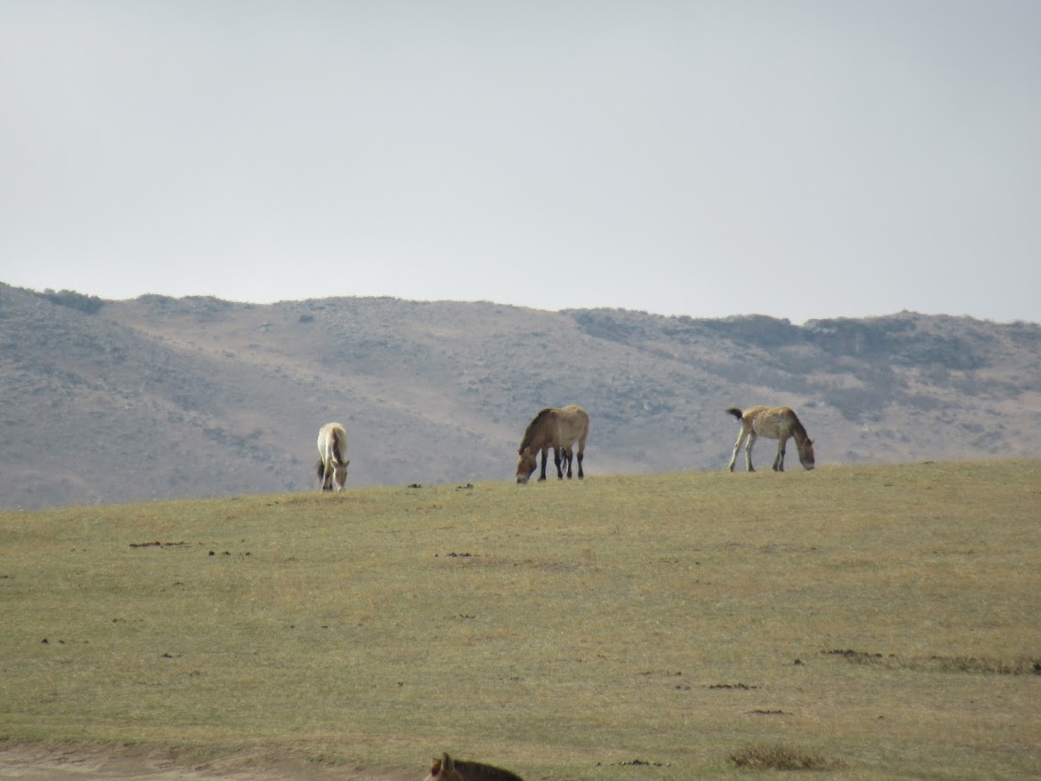 世界で唯一の野生馬類である「タヒ」。動物園ではなく自然の中で暮している野生馬はここにしかいないそうです。 「いたー!」と車を停めてくれました。車は決められた所にしか停められず、草原の中に入って「タヒ」に近づくことも許されていません。 |