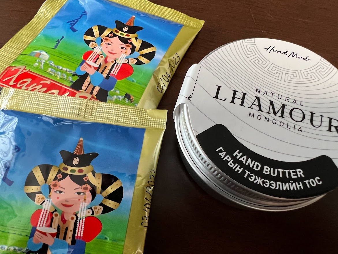 買ってきたもの。今回はスーパーフルーツと言われているチャチャルガンを使ったものを。現地でも飲んで美味しかったので。これは水で薄めて飲むジュースの素。チャチャルガンを使った化粧品もあって、クリームと化粧水を。 はちみつも有名なのだそうで、買って見ました。 チョコレートはゴールデンゴビのものを。ゲルの形をしたチョコレートパッケージがかわいい。ゲルの中もちゃんと暮らせるようになってます。 |