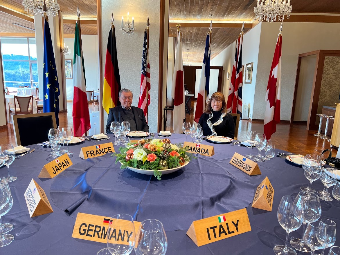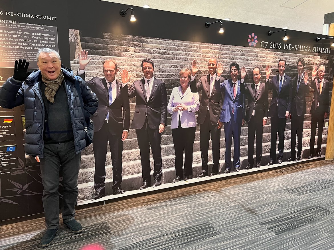 レストランの中にサミットで使われたテーブルが再現されていました。座って写真撮れるよ。 |
