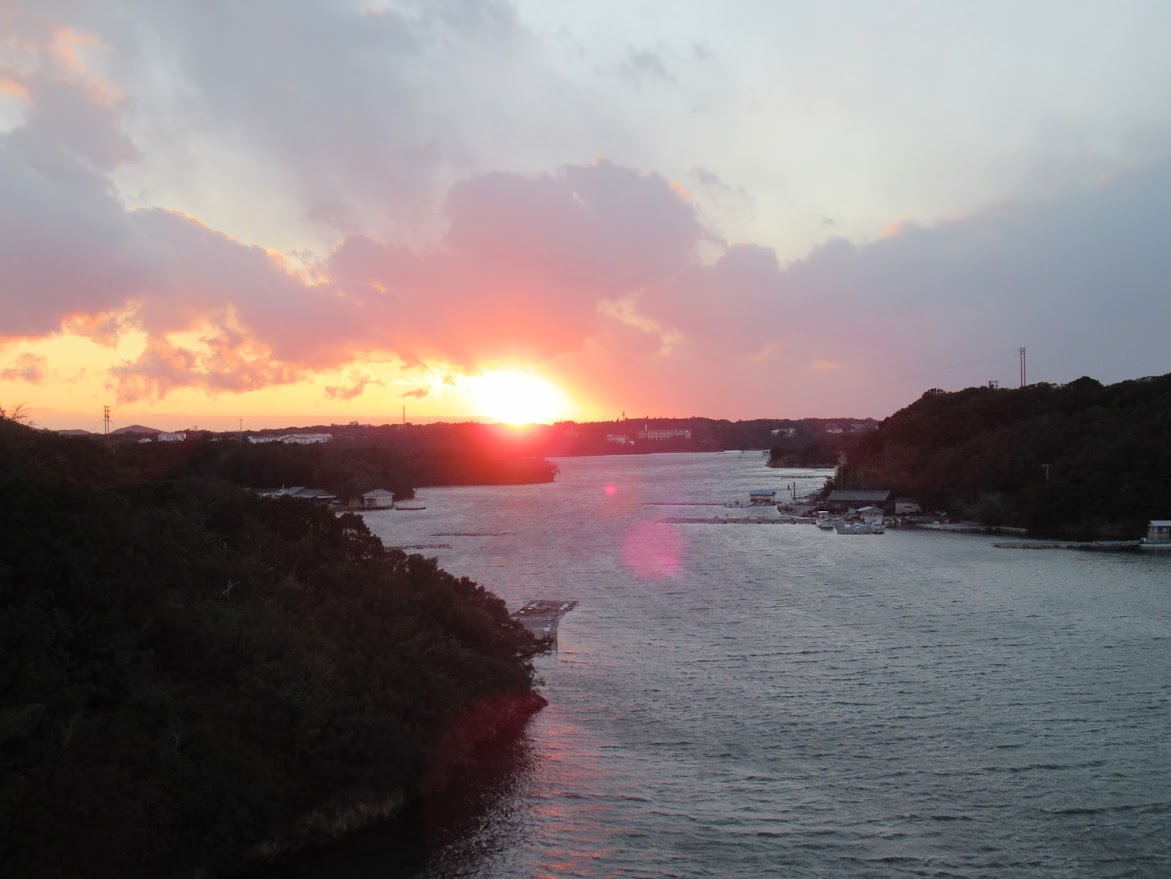 賢島大橋は夕日の絶景ポイントなんだって。 送迎バスを使わずに橋まで歩いて夕日をみることに。 |