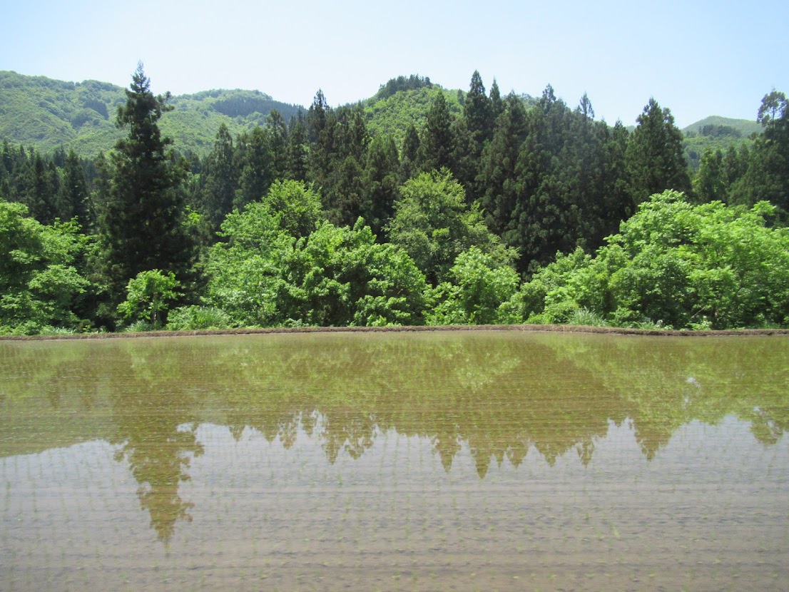 田植えが終わったばかりの田んぼ。きっと魚沼産のコシヒカリ。 |