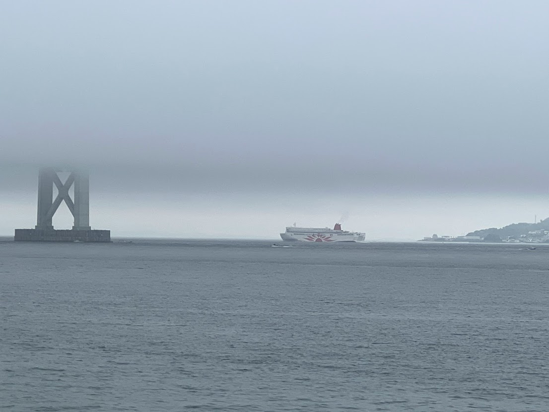 朝。明石海峡大橋の下をサンフラワーがくぐりぬけるところ。橋げただけ残して霧の中に。 |