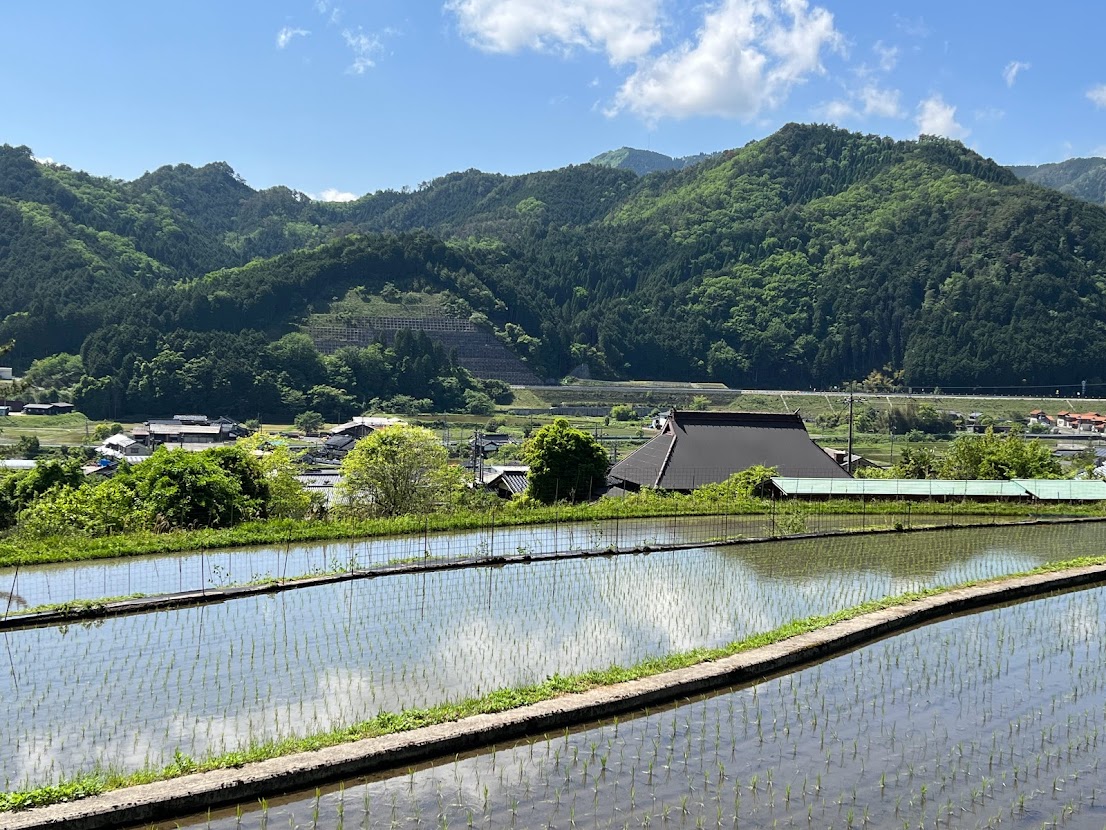 ぶどう棚や田んぼが見えます。 |