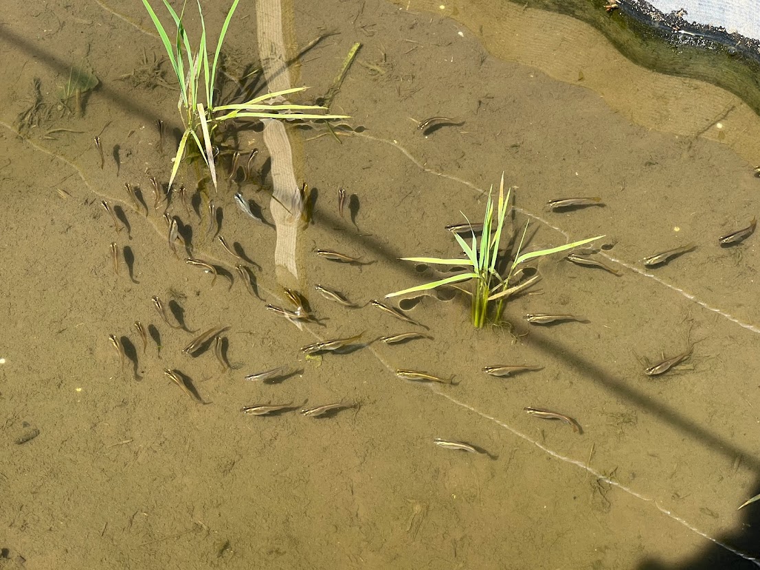 田植えが終わったばかりの田んぼにはメダカがいっぱい。有機栽培でメダカが元気に泳いでいる「メダカ米」を育てています。 |