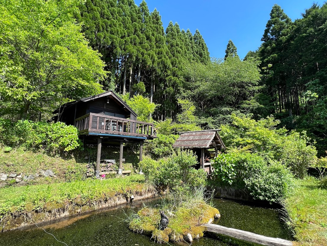 福島家の跡をとっていらっしゃるハチローさん。なにもかも自分で作られています。ここはお住まいとは違います。別宅です。トトロも自作、バス停も自作。 |